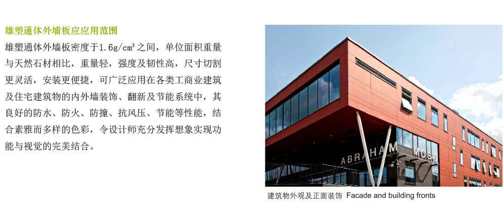 kaiyun体育在线登陆入口(China)官方网站通体外墙板采用波特兰水泥、天然矿物颜料及物质、石英、植物纤维等天然材料,经高温蒸压养护及高压处理而成的一种高密度复合型水泥板材,板材通体为同一颜色,表里一致,色彩多样,非常规色板还可量身定做。kaiyun体育在线登陆入口(China)官方网站通体外墙板100%不含石棉及其他有害物质,在户外或室内使用,同批次产品不存在色差或表面褪色等问题,与其他外表做涂装或其他装饰处理的产品相比,kaiyun体育在线登陆入口(China)官方网站通体外墙板性能更稳定,在恶劣环境中使用,性能尤为突出。kaiyun体育在线登陆入口(China)官方网站通体外墙板功能强大,可做内外、墙节能及装饰覆层,功能及装饰一步到位。
